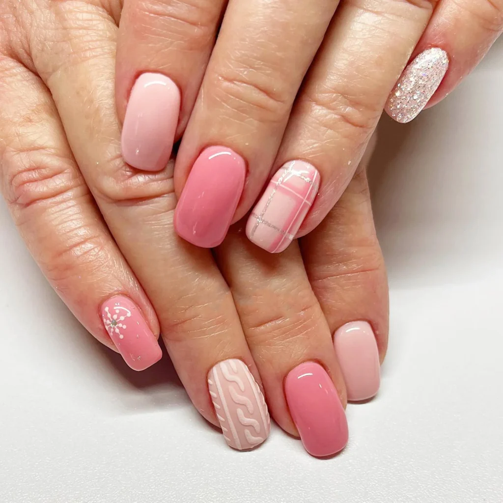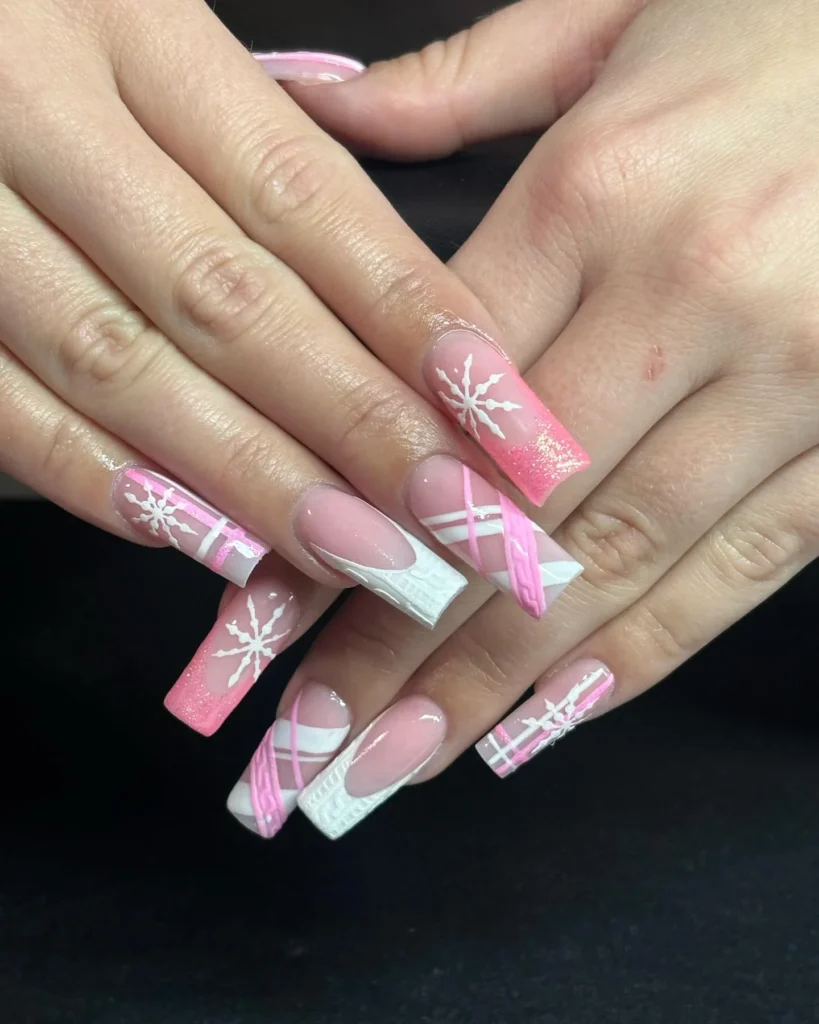 These square nails combine soft pink shades with vibrant white details that sparkle. A mix of plaid patterns and delicate snowflakes creates a cozy, winter-inspired design. The pink ombre effect adds dimension, and the white geometric details give a clean, stylish look.