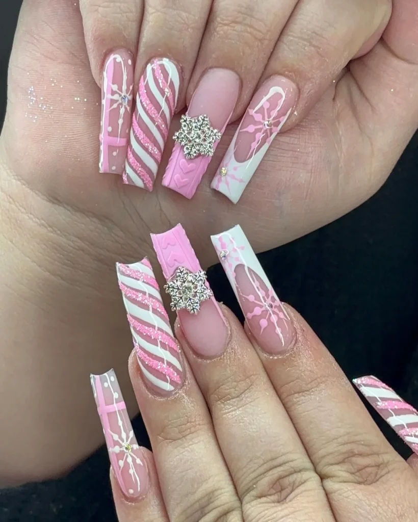 Featuring shimmering pink bases and bold candy-cane stripes, this set feels festive yet feminine. Snowflake accents add a seasonal sparkle, while the glossy finish enhances their shine under light. Each nail has its own design, creating variety without losing harmony.