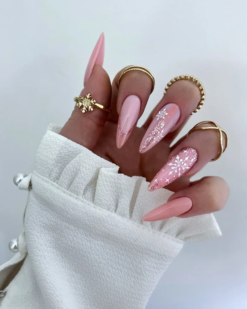 These almond-shaped nails feature a stunning combination of matte pink polish and a cheerful glittery tip. The subtle snowflake design on a few accent nails brings wintery charm, while the glitter tips add an eye-catching pop. This design strikes a balance between understated elegance and festive fun.