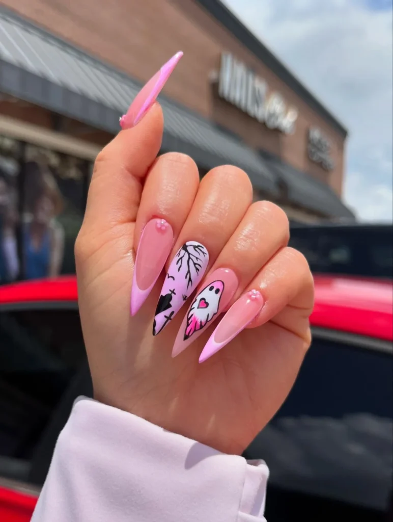 #15. Pink Nail Design with Ghost Art and Pink Detailing