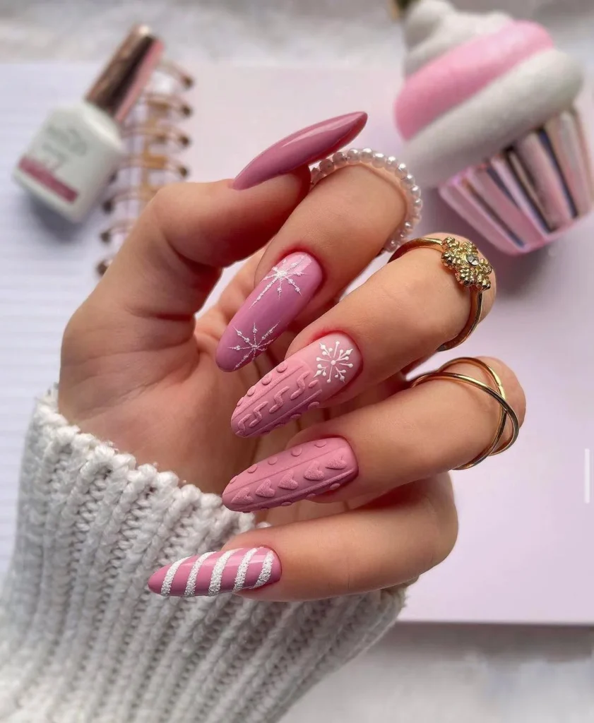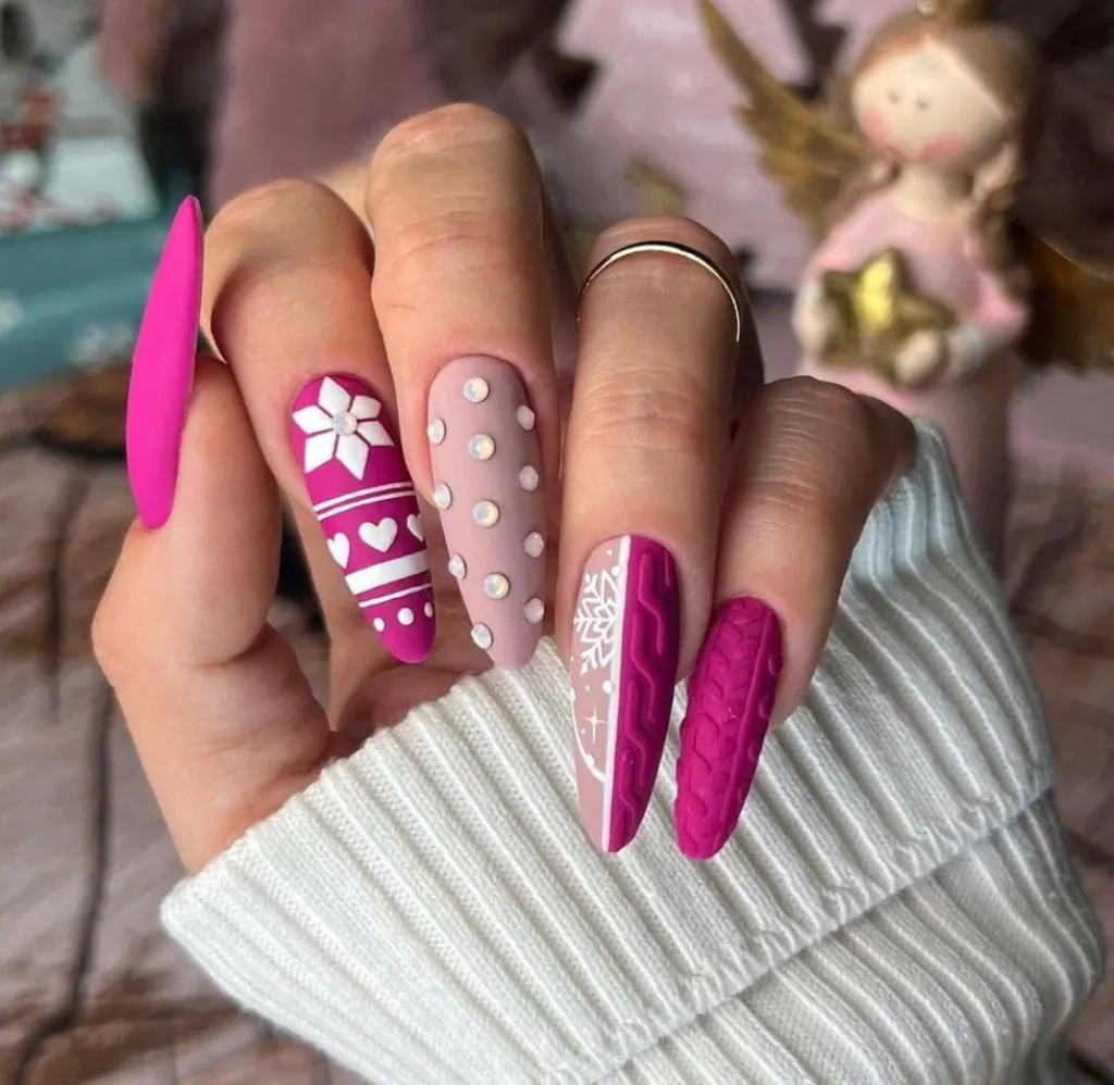 Bold yet cozy, this design mixes matte pink tones with creative sweater-like textures. Snowflakes and candy-cane stripes add variety, making each nail unique while still cohesive. The raised knit detailing gives a tactile, 3D effect that feels warm and seasonal.