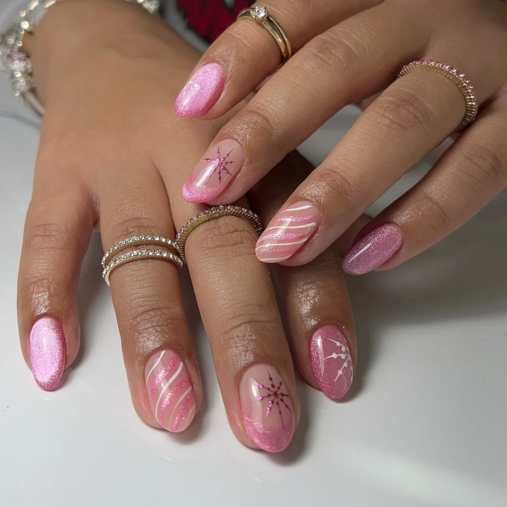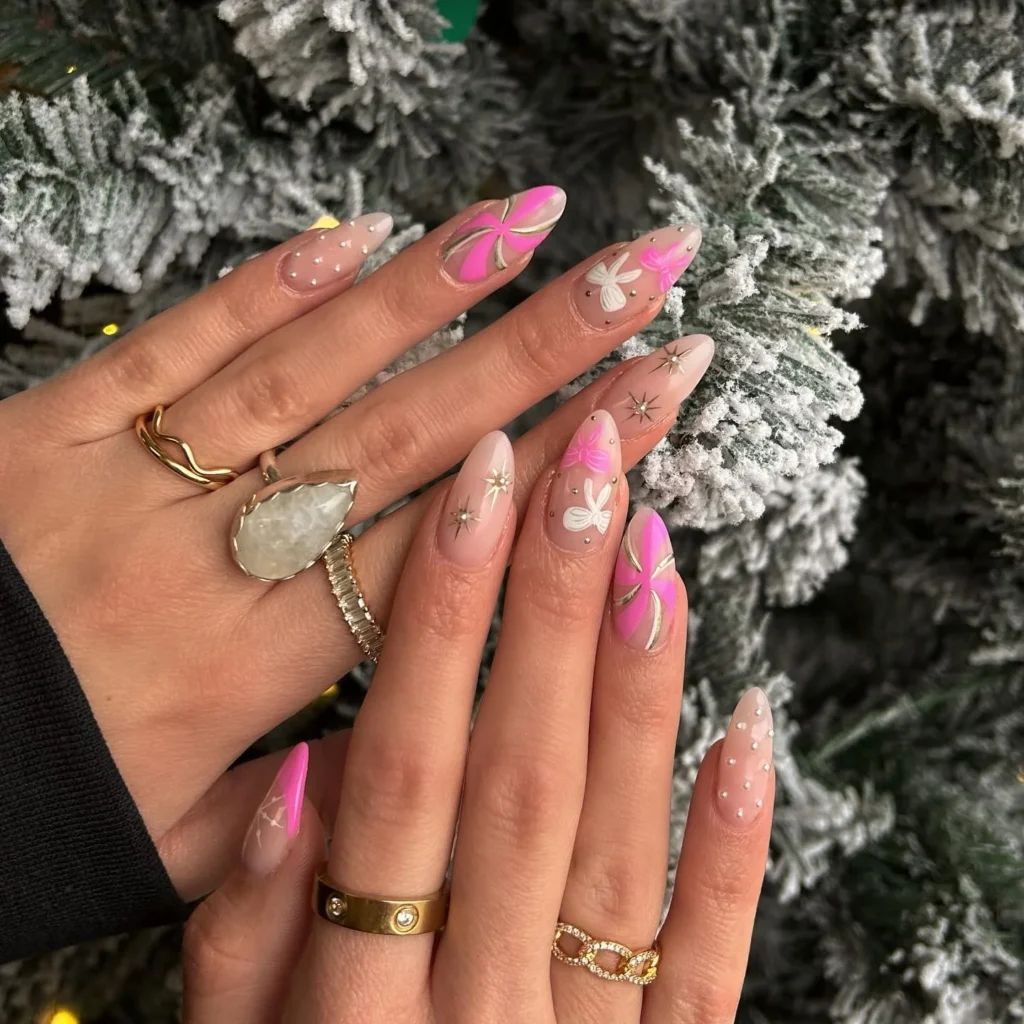 This joyful design blends a natural nude base with pops of pink, creating a festive yet elegant look. Hand-painted bows and tiny starbursts bring in holiday charm while keeping the design refined. The mix of minimal nails and decorated ones creates a stylish contrast that feels intentional and balanced.