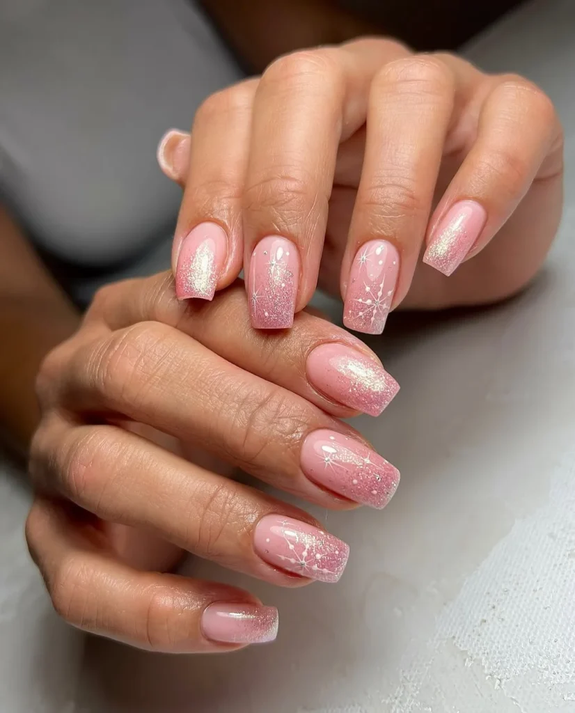 A romantic ombre effect transitions from blush pink to shimmering tips, creating a soft winter glow. The addition of delicate snowflake art enhances the frosted, seasonal look without overpowering the ombre. The square nail shape brings modern structure and polish to the set.