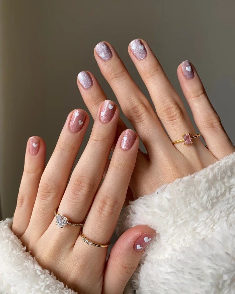 This design is sweet and understated, featuring a rose-pink glitter polish with tiny white hearts. The shorter nail length makes the look practical yet stylish, ideal for everyday wear during winter. Glitter adds a frosty sparkle that feels both festive and romantic.