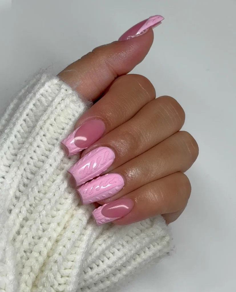 Glossy and playful, these nails pair soft pink polish with raised knit patterns for a sweater-inspired effect. The embossed detailing stands out beautifully against the shiny finish, adding a cozy winter vibe. The long square shape keeps the design elegant while letting the texture shine.
