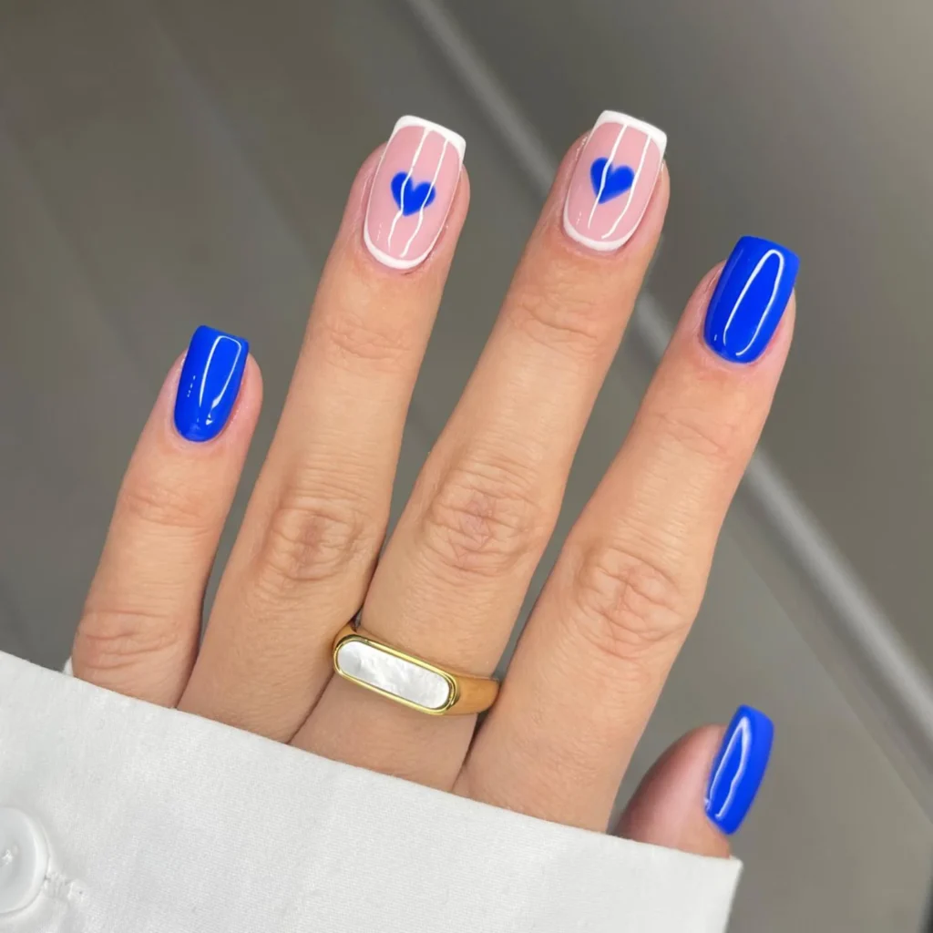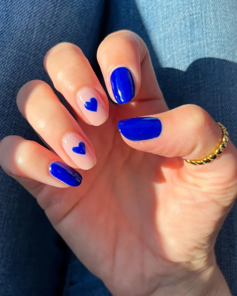 This manicure stands out with its bold blue polish on short rounded nails. The small heart accents add a sweet Valentine touch. It feels simple, fun, and perfect for everyday wear.