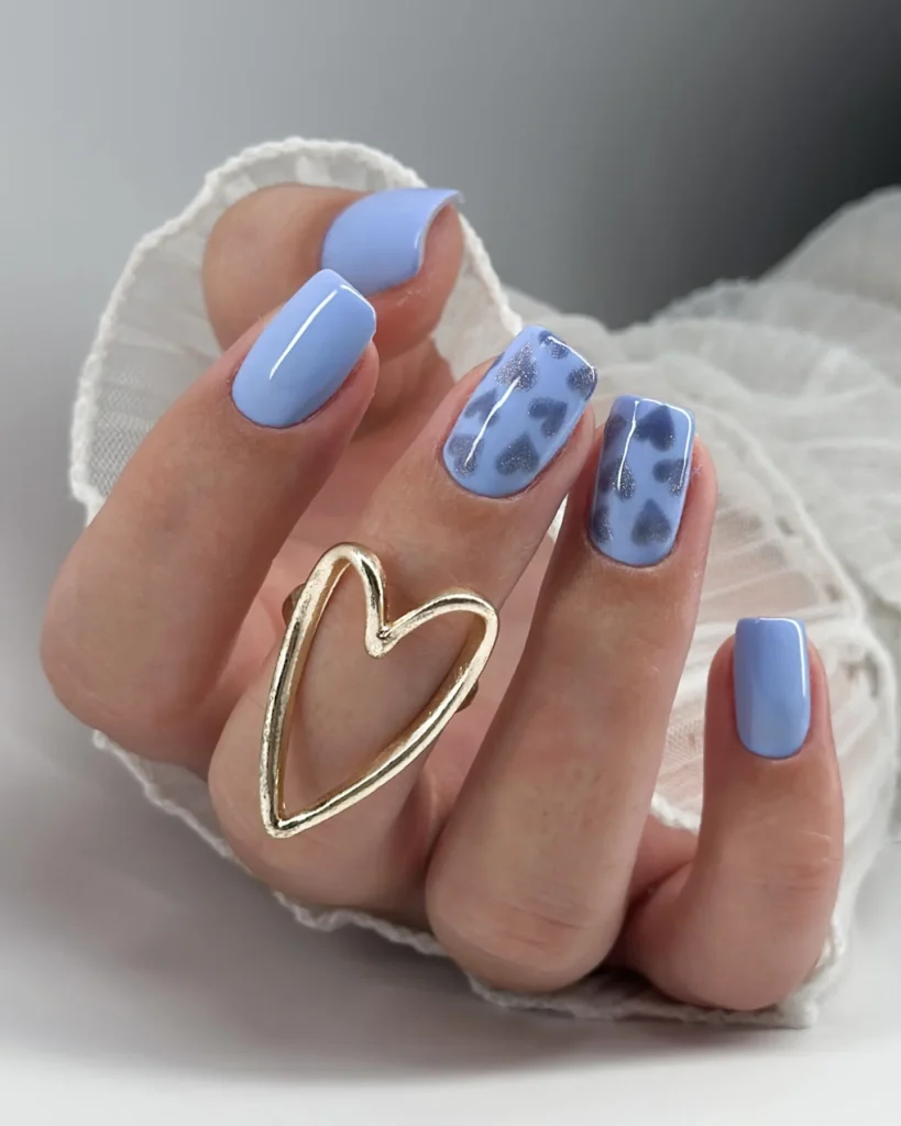 I’m drawn to the soft pastel blue shade that feels calm and airy on the square nails. The subtle heart accents add a gentle Valentine touch without overpowering the look. This design feels minimal, cozy, and effortlessly cute.