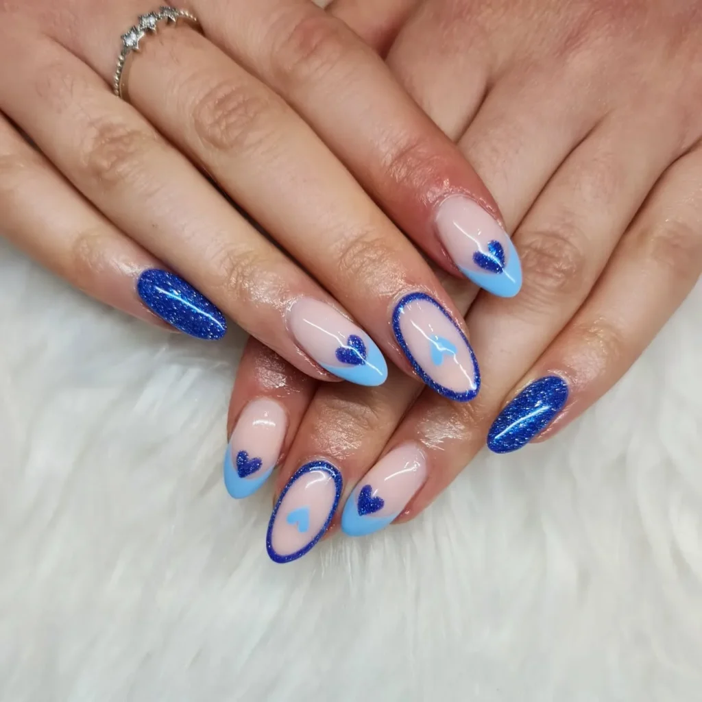 What stands out to me is the mix of nude bases and crisp blue French tips with sparkling heart details. The almond shape keeps everything elegant while the glitter adds just enough shine. This manicure feels romantic, polished, and slightly playful.