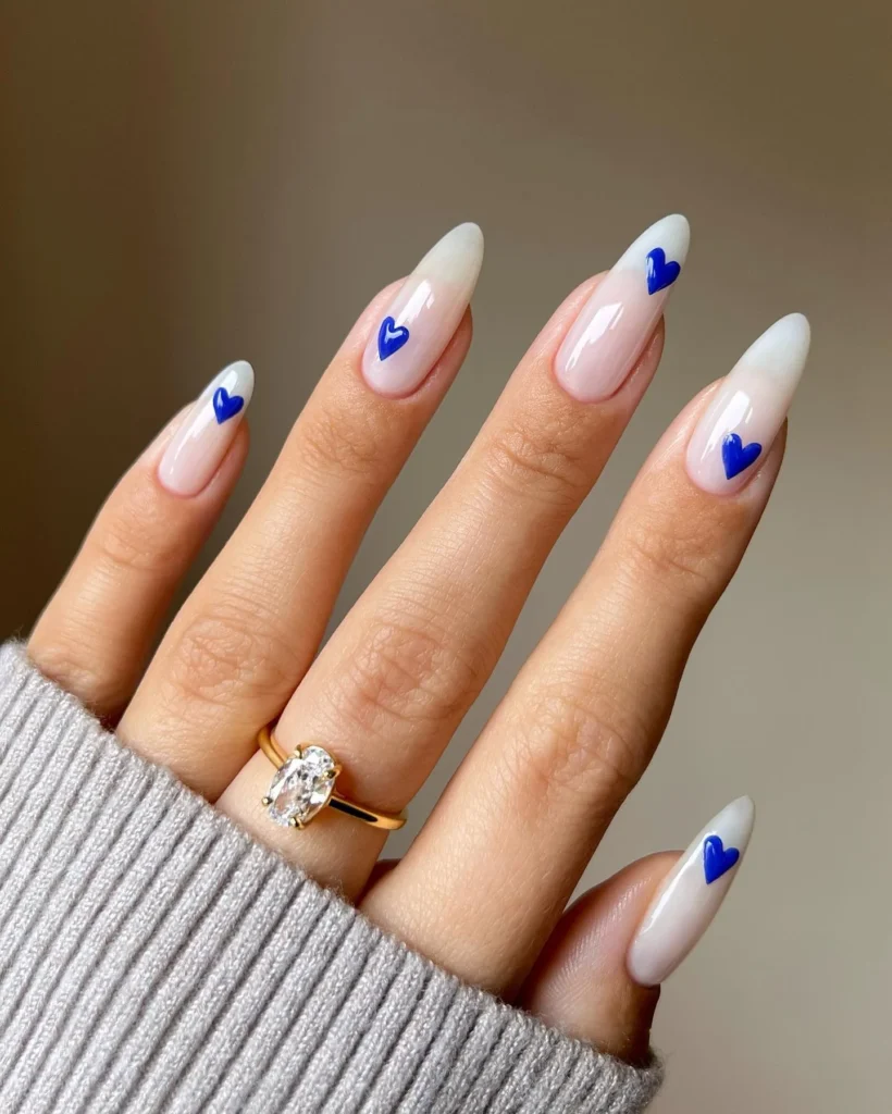 What stands out first is the clean nude base paired with glossy blue hearts. The almond shape gives the nails a polished and modern feel. This style looks minimal, romantic, and effortlessly chic.