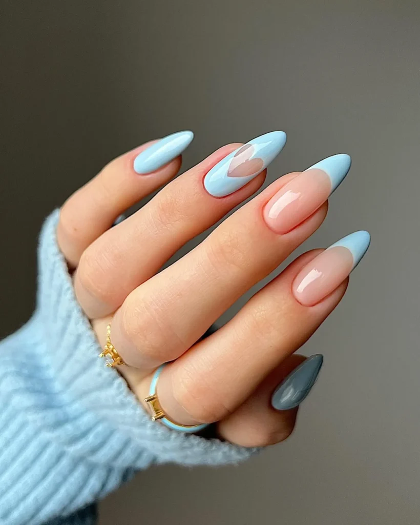 I love how the light blue French tips frame the nude base so smoothly. The single heart accent adds just enough Valentine charm without overpowering the look. This manicure feels refined, trendy, and easy to wear.