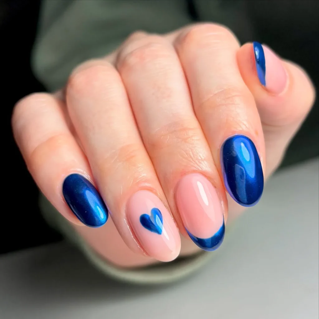This set catches my eye with its deep navy blue shine and bold contrast. The heart detail on the nude nail softens the look beautifully. It feels confident, romantic, and slightly dramatic.