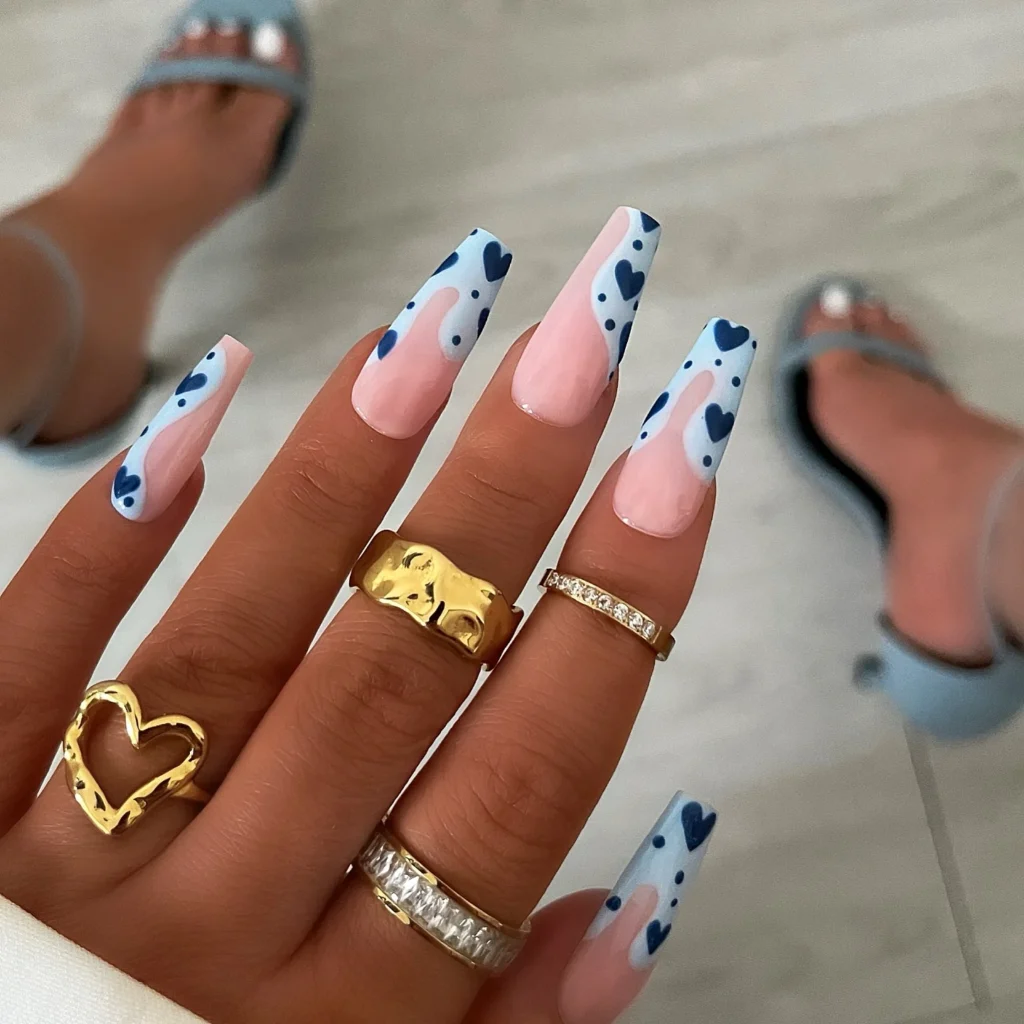 #5. Blue and Pink Coffin Nails With Heart Pattern