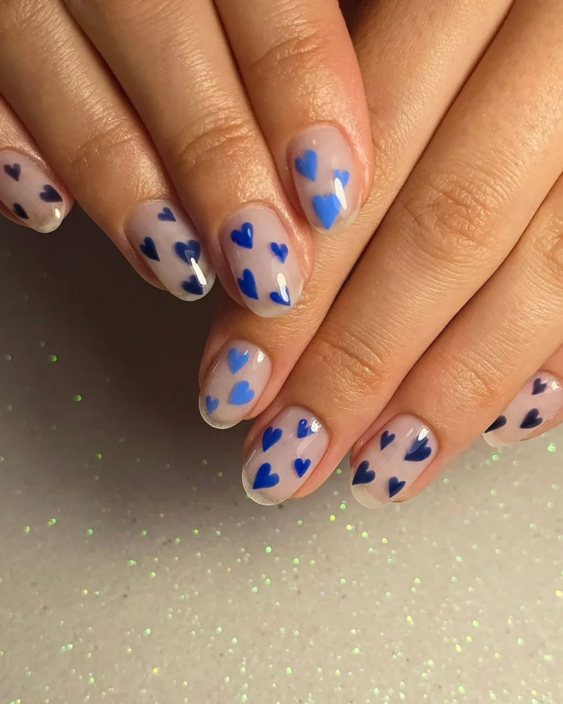 I’m drawn to the sheer nude base covered in scattered blue hearts. The short rounded shape keeps the design soft and natural. This manicure feels playful, sweet, and very wearable.