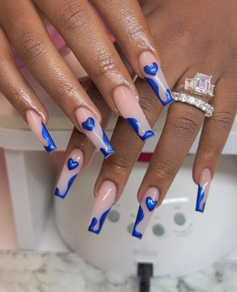 #8. Nude Coffin Nails With Metallic Blue Heart Tips