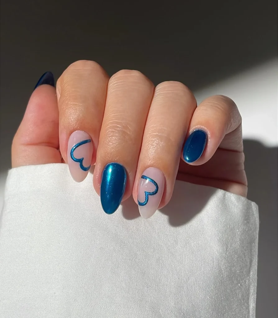 I instantly notice the clean nude base paired with metallic blue heart outlines. The almond shape keeps everything smooth and elegant. This design feels minimal, stylish, and quietly romantic.