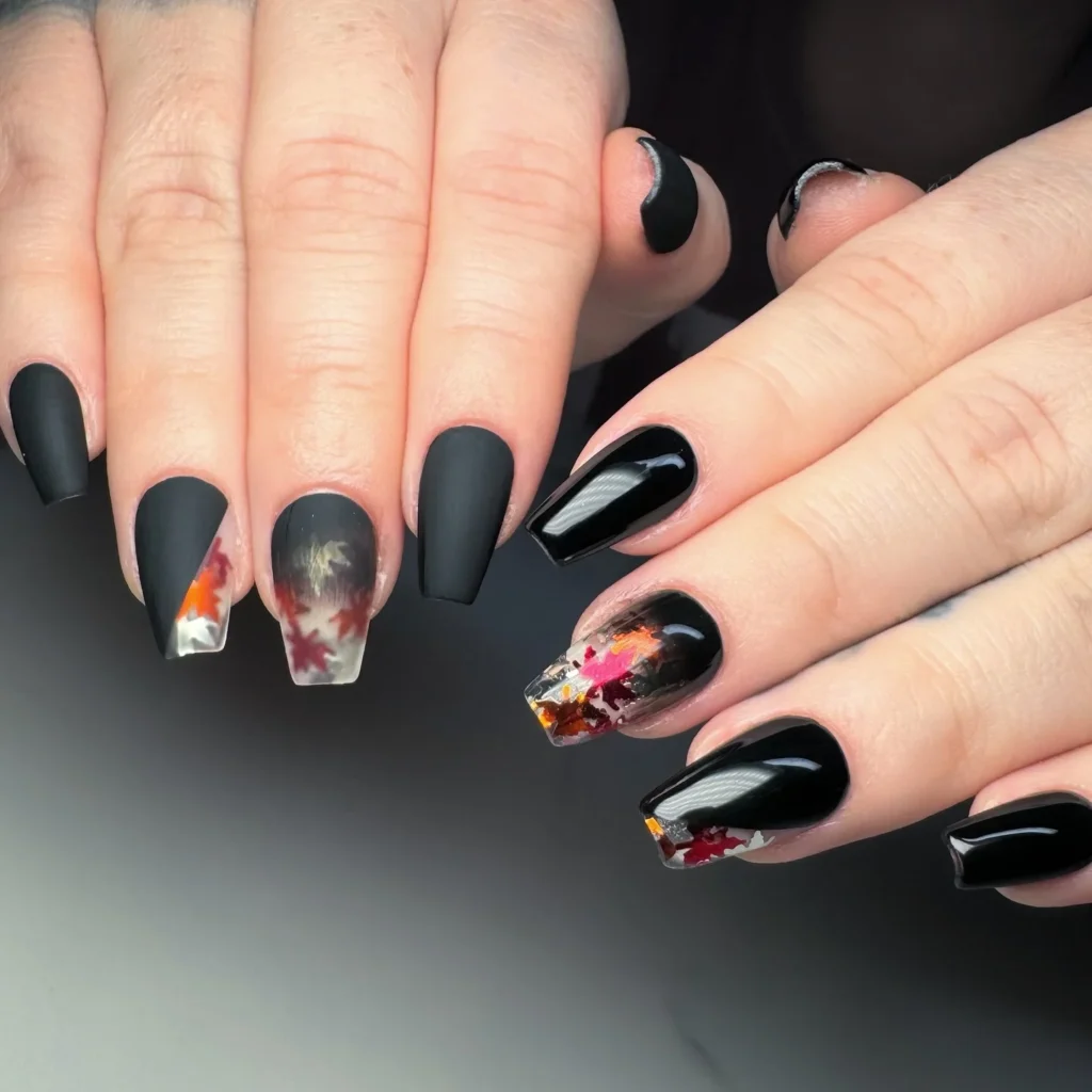 Merging boldness with seasonal charm, these coffin nails combine matte black polish with glossy black accents and transparent tips. The clear tips are filled with autumn leaf decals, bringing a burst of warm color against the dark backdrop. The matte and glossy contrast adds depth, keeping the look modern and sophisticated.