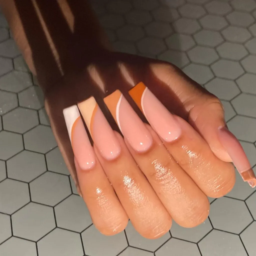 These sleek coffin nails feature a glossy nude base with vibrant orange and white diagonal French tips. The alternating color accents create a playful yet balanced style, with clean lines that keep the design polished. The warm orange pops beautifully against the nude background, making it perfect for fall vibes.