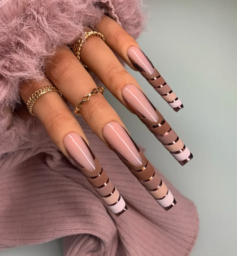 Designed with a chic retro aesthetic, these coffin nails pair a soft nude base with striped brown tips. The alternating shades of chocolate and beige are separated by metallic rose-gold lines, giving the design a luxe feel. The long coffin length enhances the bold stripes, turning each nail into a statement piece.