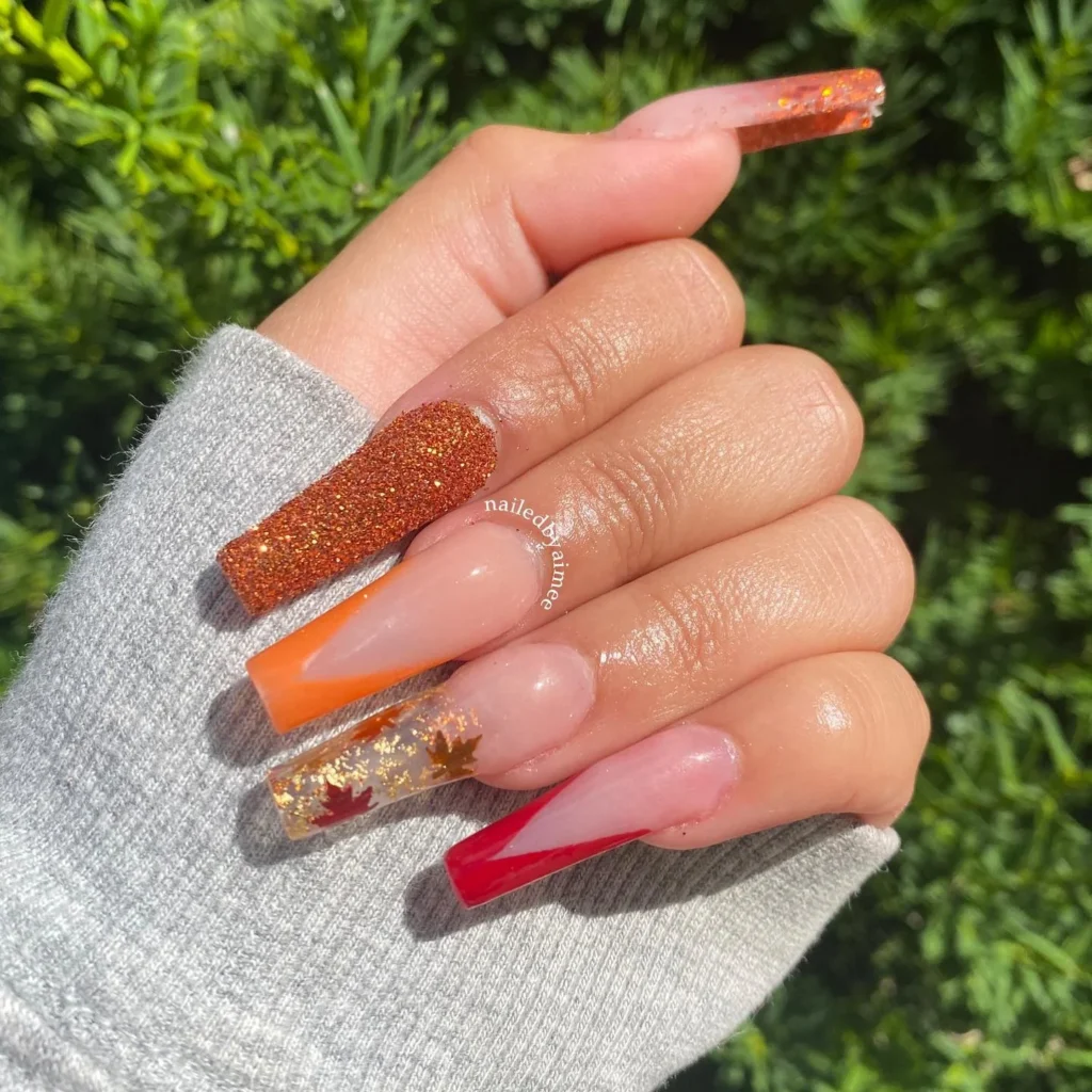 Bold and seasonal, these nails combine a mix of finishes including solid glitter, bright orange polish, and transparent tips with maple leaf decals. The red French tip adds another layer of variety, making every nail unique while still cohesive. The glitter effect reflects sunlight, giving the nails a festive sparkle perfect for fall.
