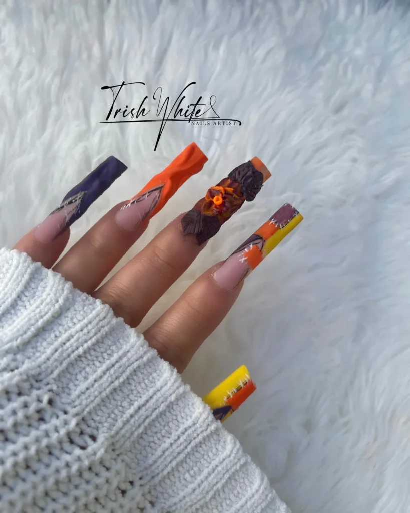 These coffin nails push creativity with a mix of bold colors and textured 3D elements. Dark purple, burnt orange, and yellow tips feature stitched detailing, mimicking a patchwork effect. The highlight is a 3D floral accent in deep brown and orange, adding dimension and drama to the look.