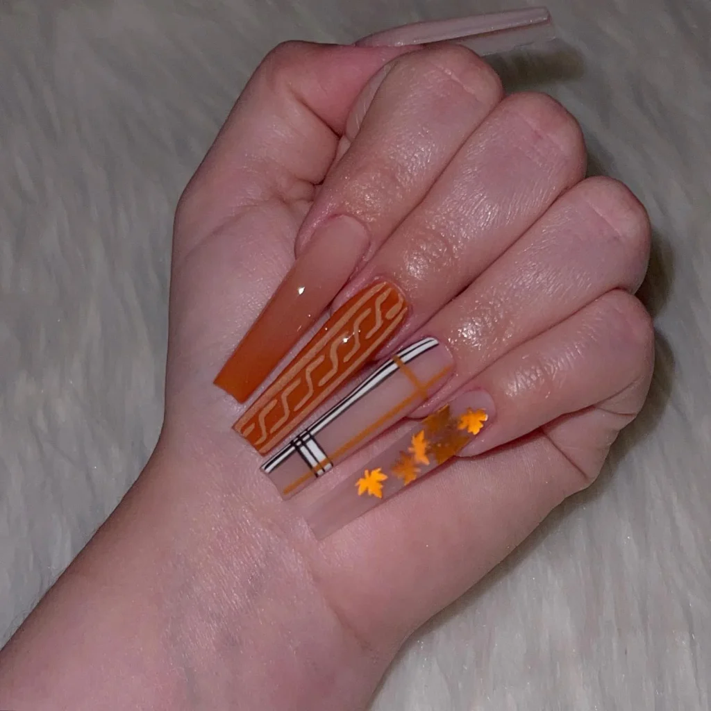 Designed with fall spirit, these nails highlight long coffin tips that blend from a nude base into transparent ends. Scattered maple leaf decals in rich autumn shades create the focal point, offering a joyful seasonal touch. A single burnt orange accent nail ties the design together and adds warmth.