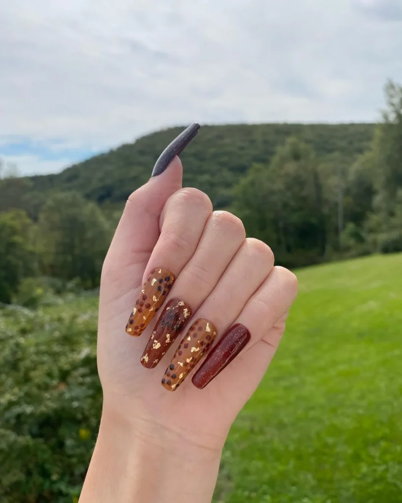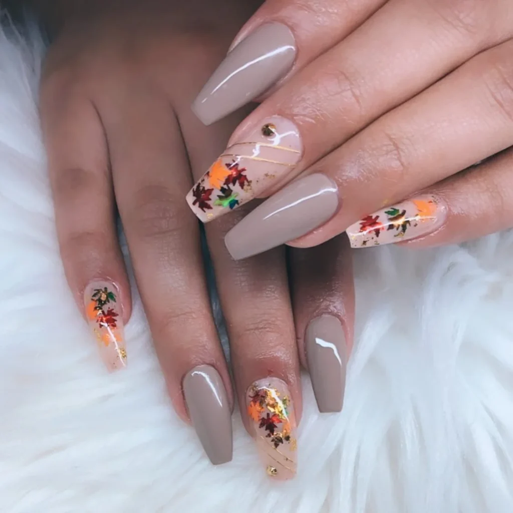 Blending earthy sophistication, these nails pair glossy taupe shades with transparent coffin nails decorated with autumn leaf decals. Golden lines and small studs bring just the right amount of shimmer, tying the neutral and seasonal tones together. The taupe nails create a soft, calming base that lets the leaf art stand out with vibrancy.