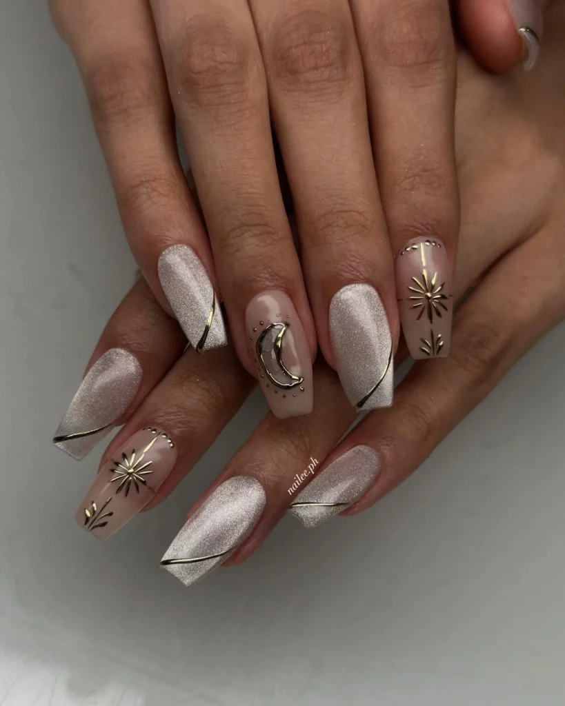 Inspired by the night sky, these nails feature a shimmering nude base with delicate celestial gold designs. Tiny golden moons, stars, and dotted details are carefully placed for a sophisticated and mystical touch. Metallic gold striping adds structure, while the glossy nude shimmer keeps the look soft and elegant.