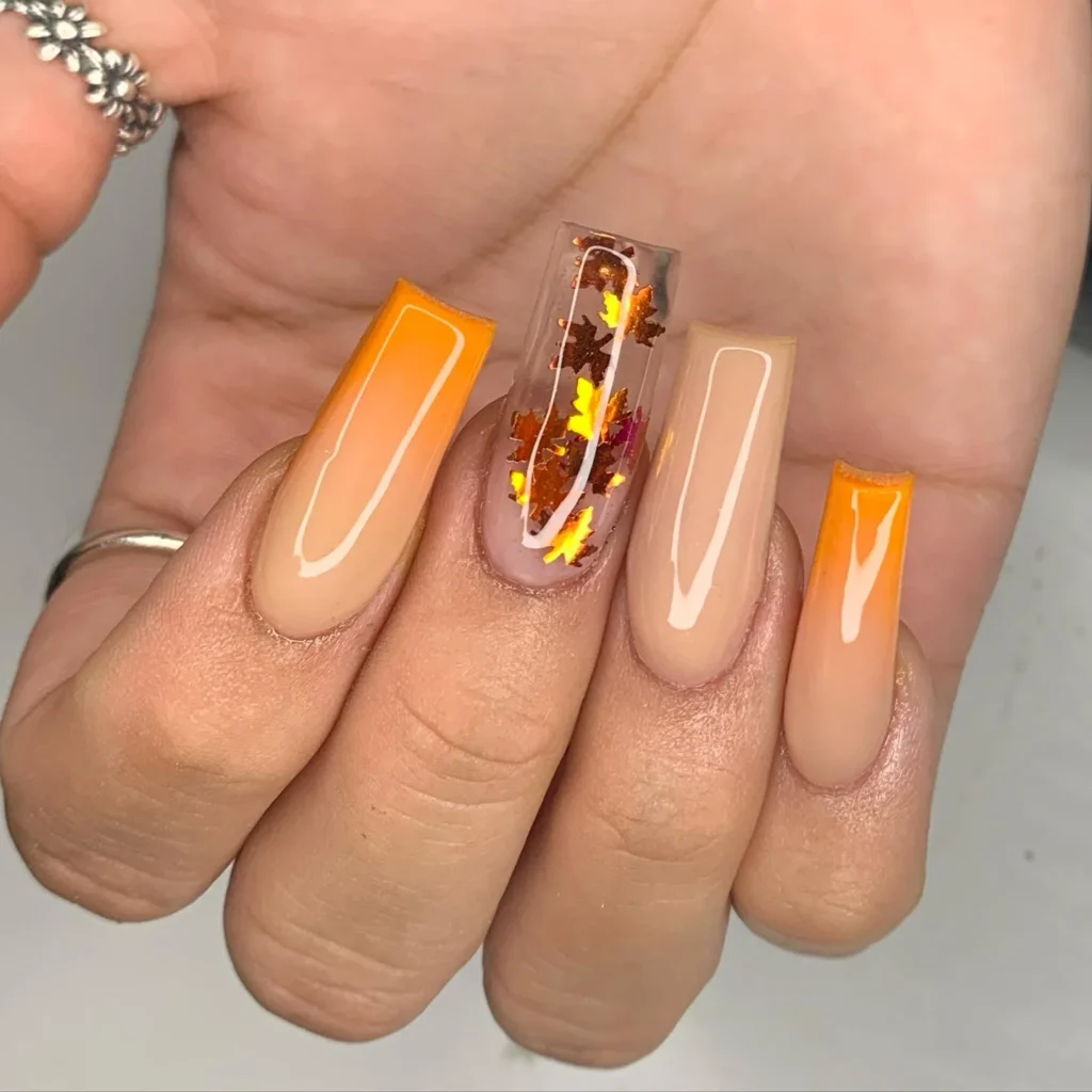 Playful yet polished, these nails feature a nude-to-orange ombre effect with a transparent accent nail filled with maple leaf decals. The gradient orange tips add warmth, while the leaves bring a clear autumnal reference. The glossy finish enhances the boldness of the design, keeping it modern and eye-catching.