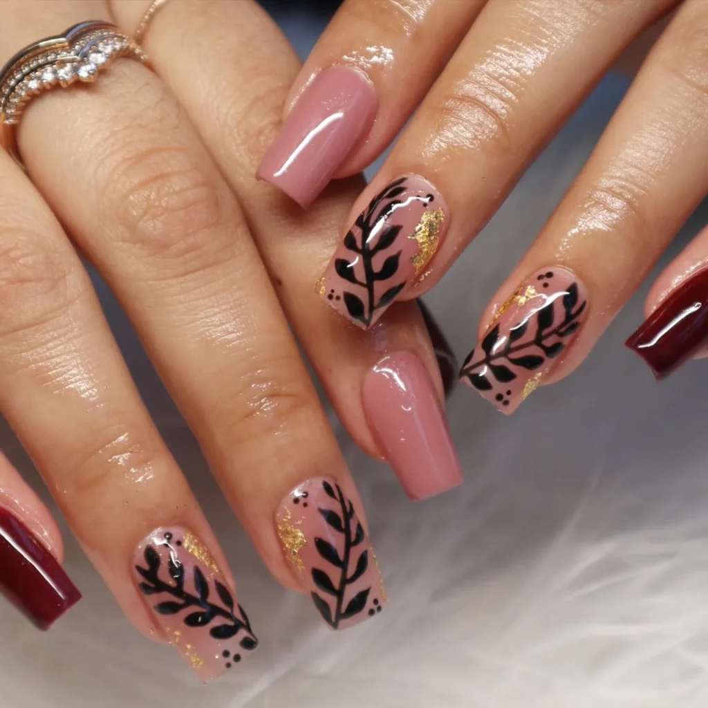 Designed with artistry, these coffin nails combine a muted mauve polish with intricate black leafy patterns. Gold foil accents shimmer against the neutral backdrop, creating a balance between natural charm and striking detail. The addition of a deep maroon nail provides contrast and brings out the warm undertones of the set.
