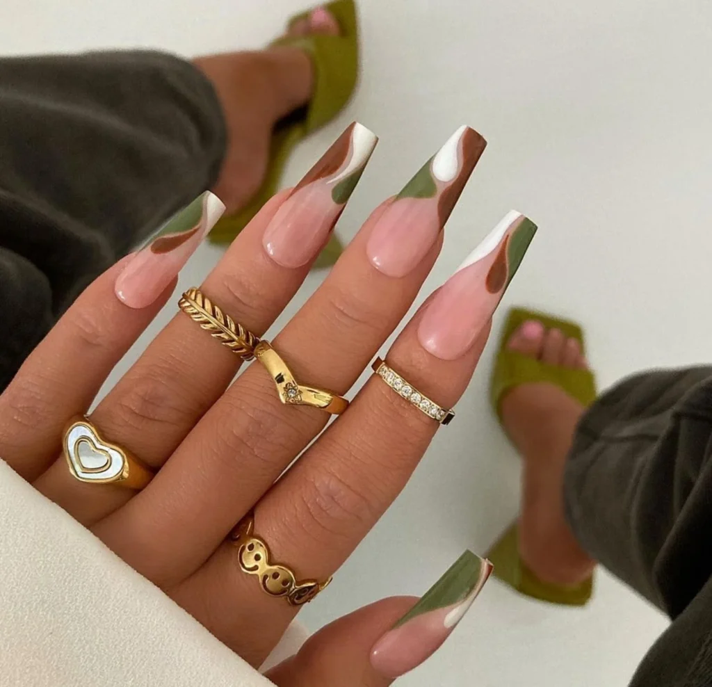 Inspired by earthy landscapes, these coffin nails feature abstract swirls of green, brown, and white on glossy nude bases. The flowing patterns mimic natural movement, giving each nail a sense of energy and creativity. Long coffin tips emphasize the design, drawing attention to the dramatic curves of the swirls.