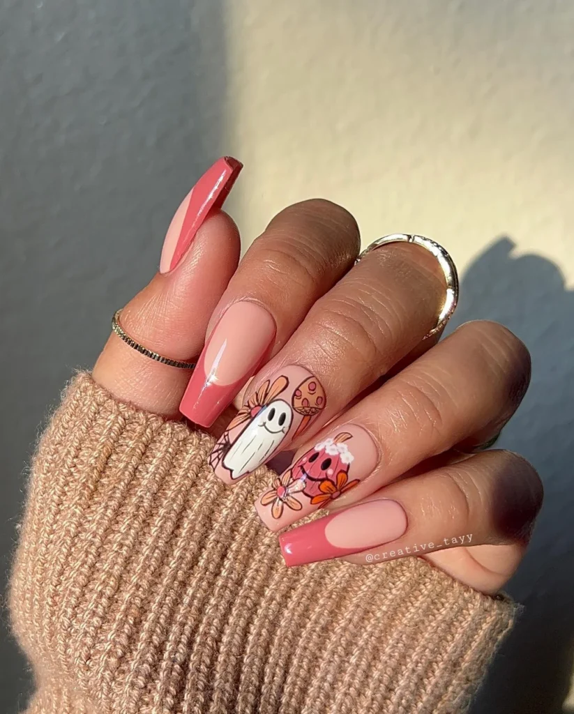 Styled for seasonal fun, these coffin nails blend playful Halloween art with a feminine color palette. A soft nude base pairs beautifully with pink French tips, while cartoon-like ghosts, pumpkins, and floral details bring a whimsical vibe. The artwork is detailed yet lighthearted, keeping the look fun without being overly spooky.