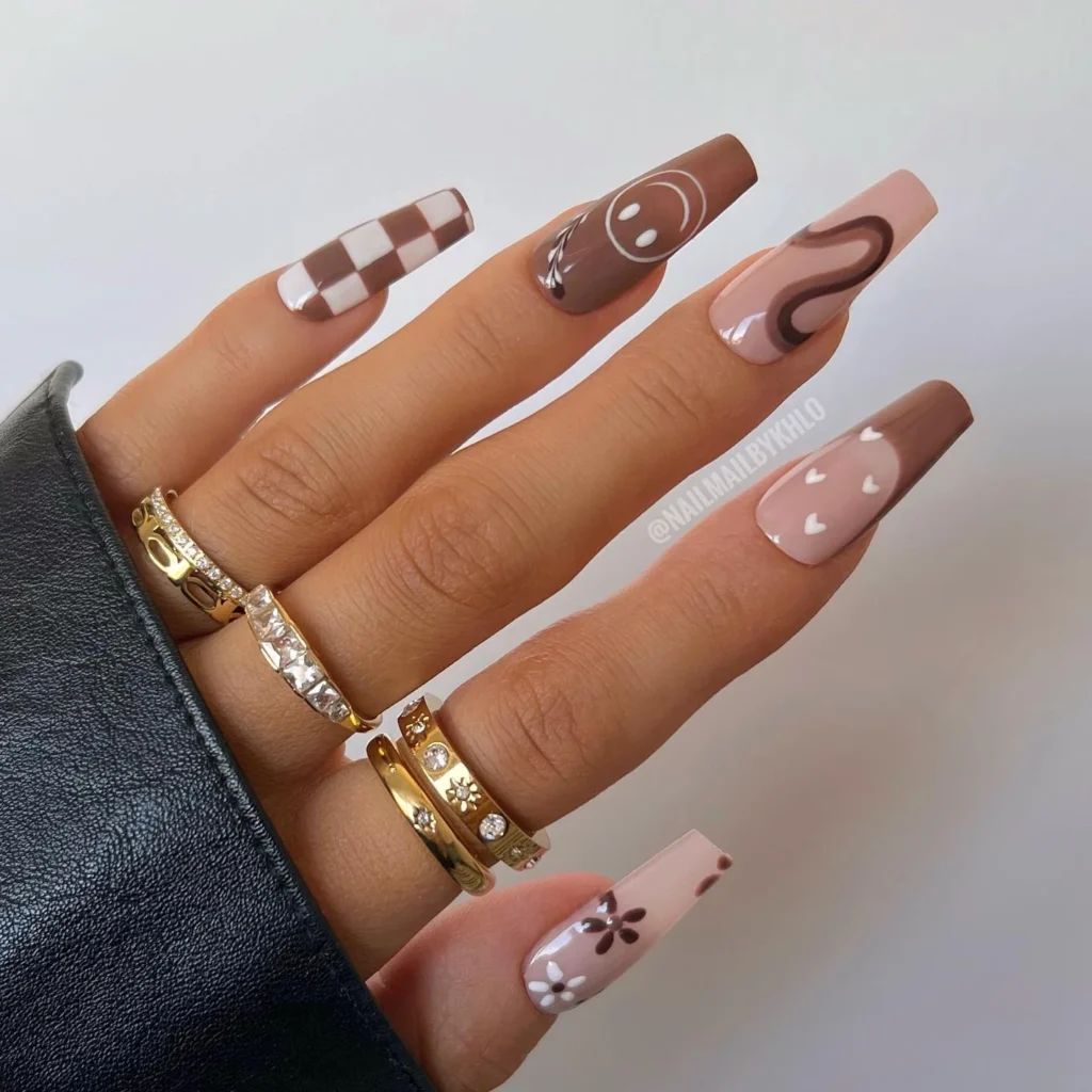 Created with retro inspiration, these nails mix mocha and nude tones with playful graphic details. Checkerboard patterns, smiley faces, and tiny hearts all work together in a cohesive fall palette. Each nail is different but still feels unified, showing off both creativity and balance.