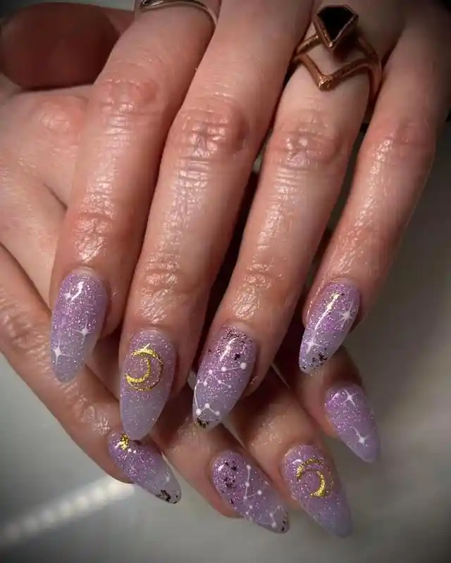 #1. Lavender Galaxy Nails With Golden Moons