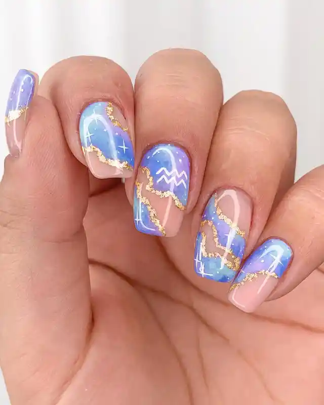 #7. Soft Gradient Aquarius Nails With Golden Symbols