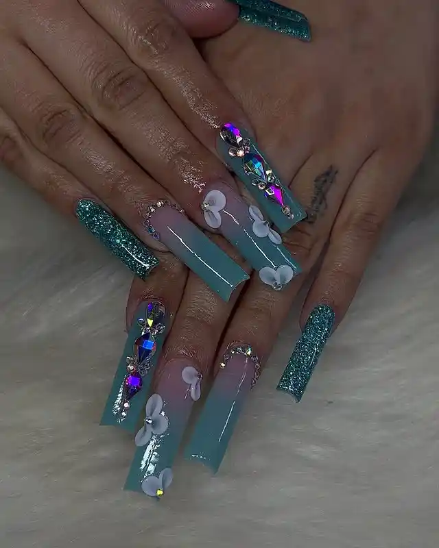 These nails make me feel like an underwater fairy, and I’m not even mad about it. The teal glitter and ombré tips already look extra, but the 3D flowers and chunky crystals take it to a new level of drama.