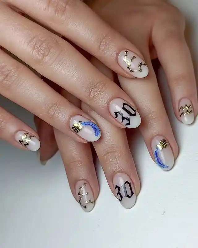I love how clean and calm this set feels. The soft nude base keeps everything simple, but the tiny gold constellations, blue swirls, and Aquarius symbols add just enough zodiac energy. The little “30” lettering makes it feel personal, almost like a secret birthday code on my nails.