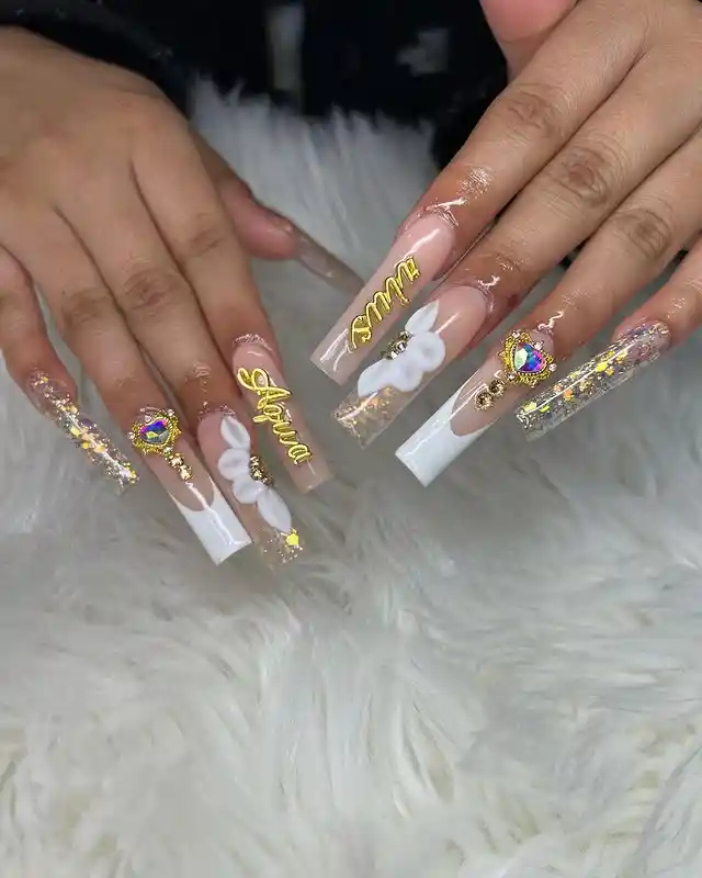 These nails are giving full “I am the moment” energy. The clear tips with gold flakes, big white flowers, and those bold gold Aquarius words make it impossible not to stare at my own hands.