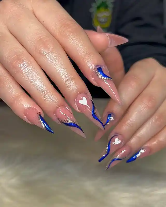 These nails look like little streams of water flowing down my fingertips. The nude base keeps them light, while the bold blue swirls and tiny bits of gold shimmer give them that electric Aquarius feel. I really like the tiny white hearts in the center, it’s like my nails are low-key romantic without being cheesy.