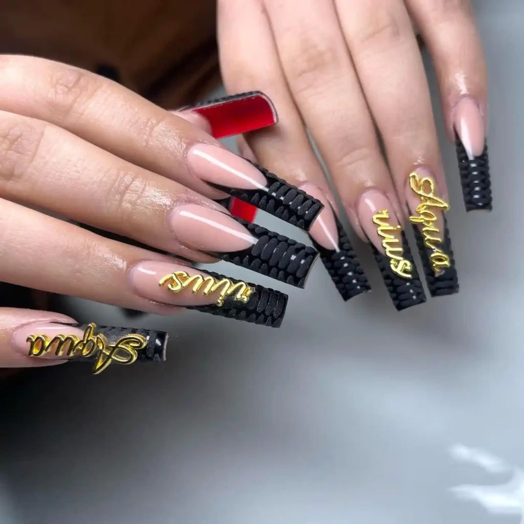 This set feels tough and glam all at once. The matte black, tire-like texture on the tips gives off serious edgy vibes, and the gold “Aquarius” charms add just enough flash.
