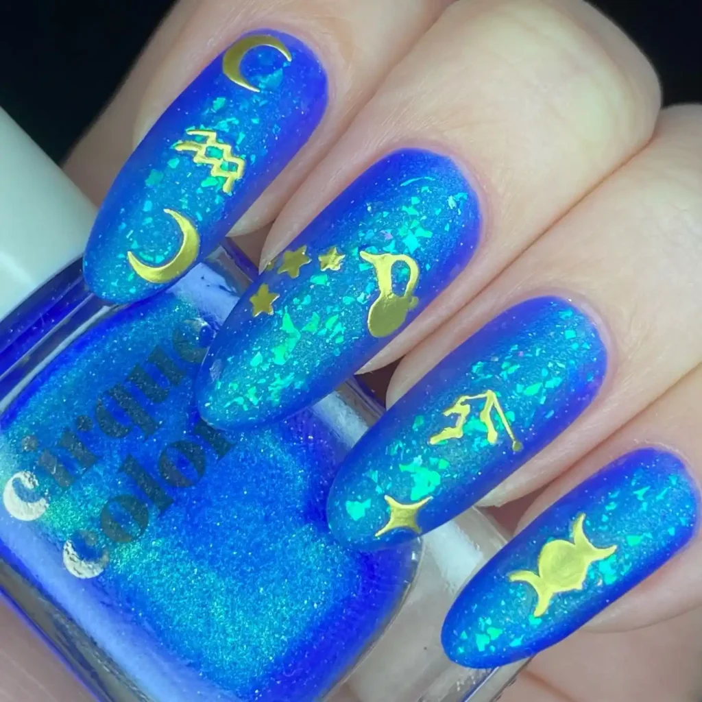 These nails look like they were painted with stardust. The electric blue base has that glowing, shifty shimmer, and the golden moons, stars, constellations, and water jug symbols sit on top like little pieces of jewelry. I love how the colors contrast so sharply, it’s impossible not to notice them.