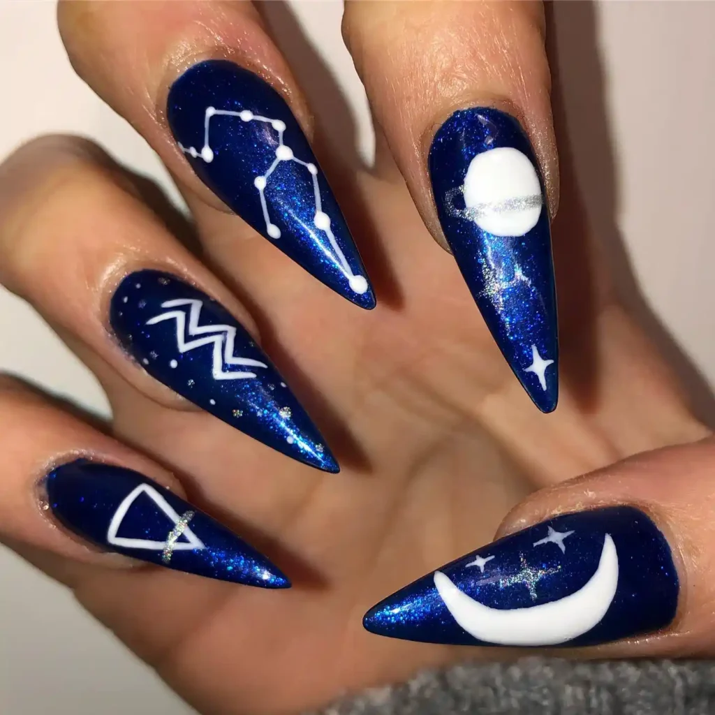 #20. Deep Navy Aquarius Constellation Stiletto Nails