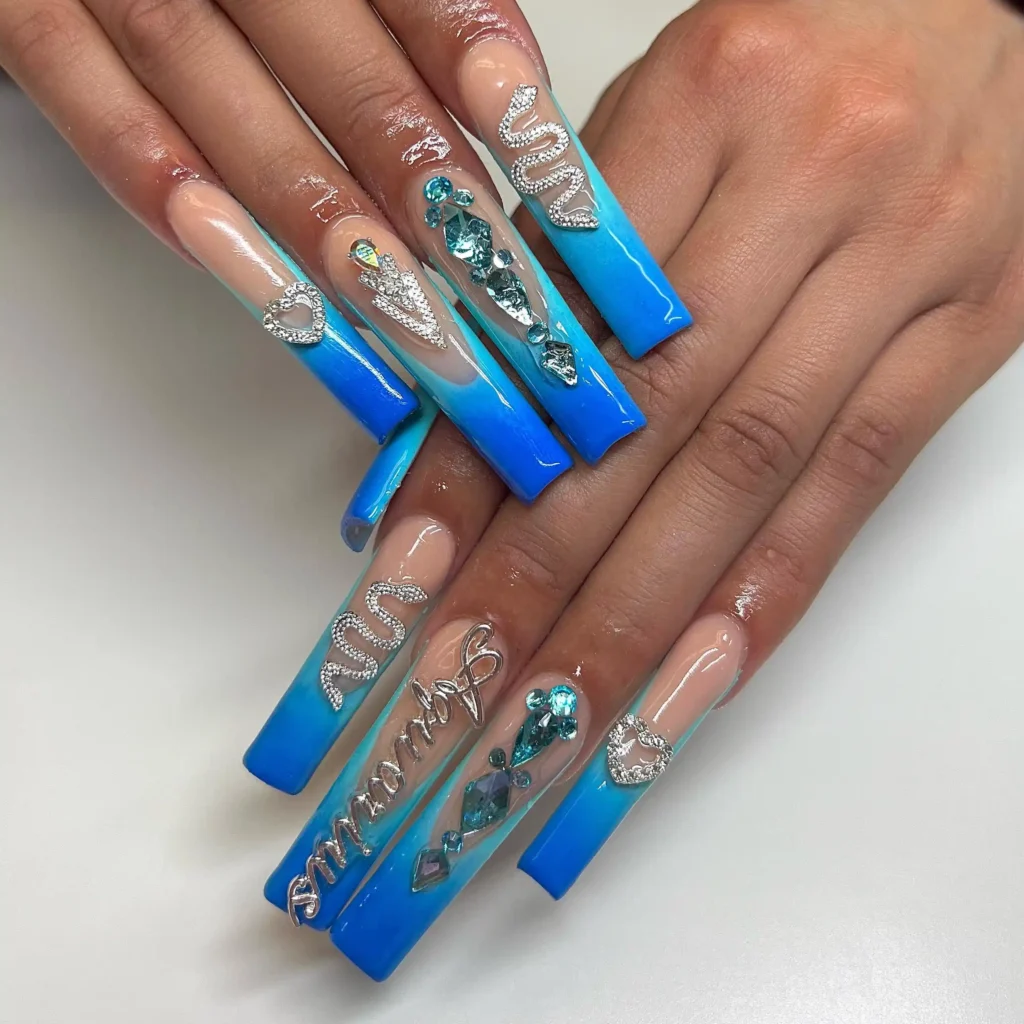 This design is full extra, and I’m not mad about it. The bright blue ombre tips already grab attention, but the gems, charms, and Aquarius script take it to a whole new level.