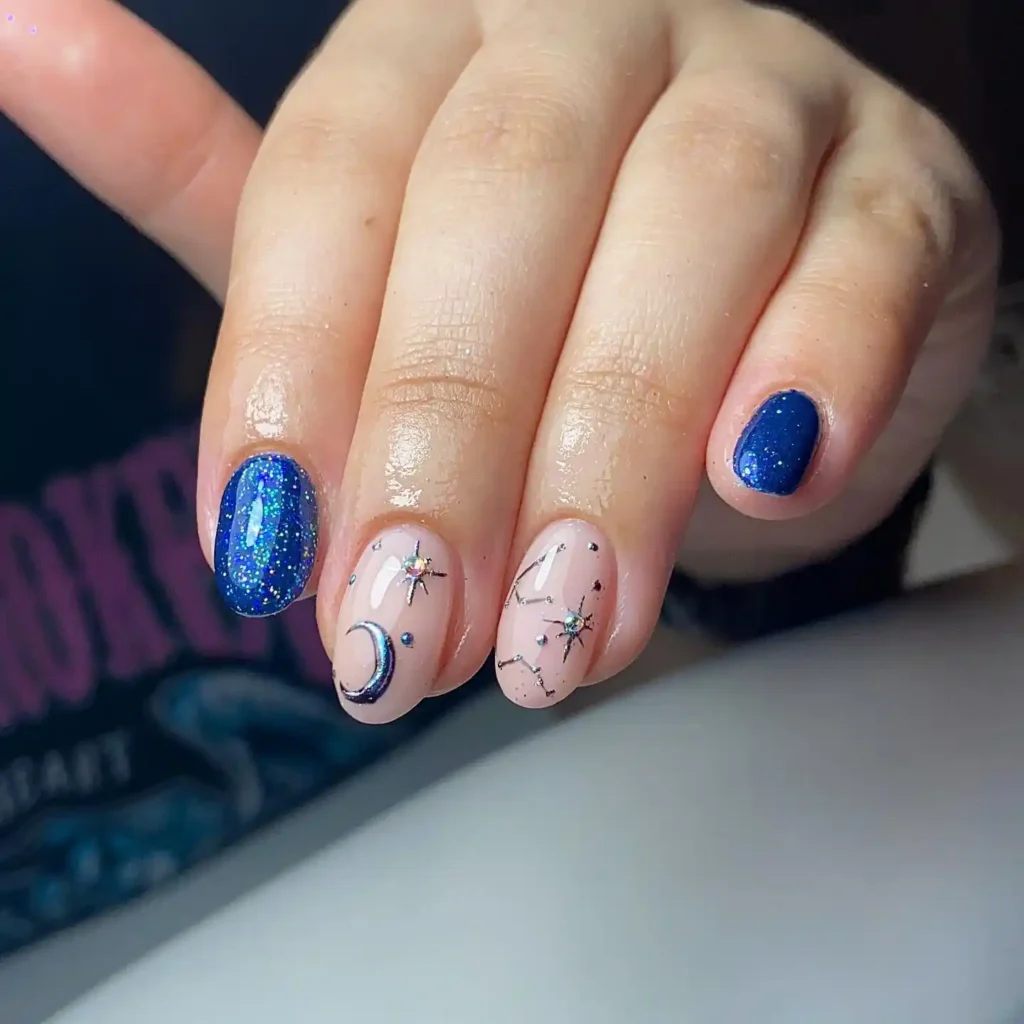 These nails remind me of a clear night sky in the middle of winter. The deep blue shimmer on a couple of nails feels rich and moody, while the nude nails with tiny stars and a crescent moon keep things soft. I like how the design hints at constellations without being too busy.