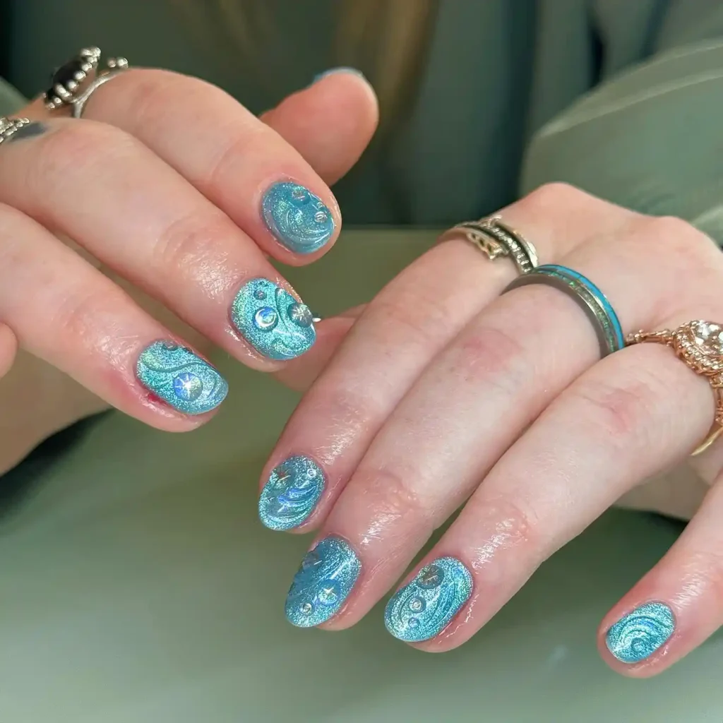These nails look like swirling water, which fits Aquarius so well. The aqua shimmer base has this cool, wavy pattern, and the little gems on top almost look like air bubbles rising to the surface.