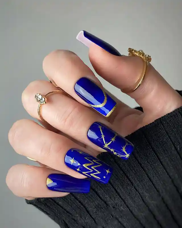 #6. Royal Blue Aquarius Nails With Gold Details
