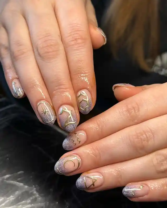These nails are like the gentle side of Aquarius energy. The gradient from nude to shimmery lilac feels really soft, and the tiny gold symbols, stars, and lines give it just the right amount of zodiac detail.