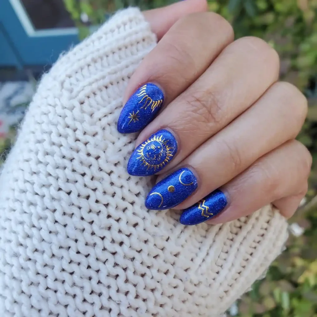 This design makes my hands look like they’re hosting a tiny universe. The deep blue sparkly base is so pretty on its own, but the golden sun, moons, and Aquarius waves turn it into a full celestial moment.