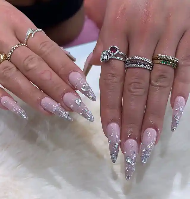 These nails give me frosty, wintery Aquarius vibes. The soft pink base keeps them light and feminine, while the sharp stiletto tips covered in chunky silver glitter bring all the drama.