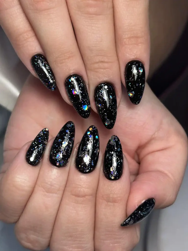 There’s something about black glitter nails that feels quietly powerful. Not loud. Not trying too hard. Just that perfect little shimmer when the light hits.