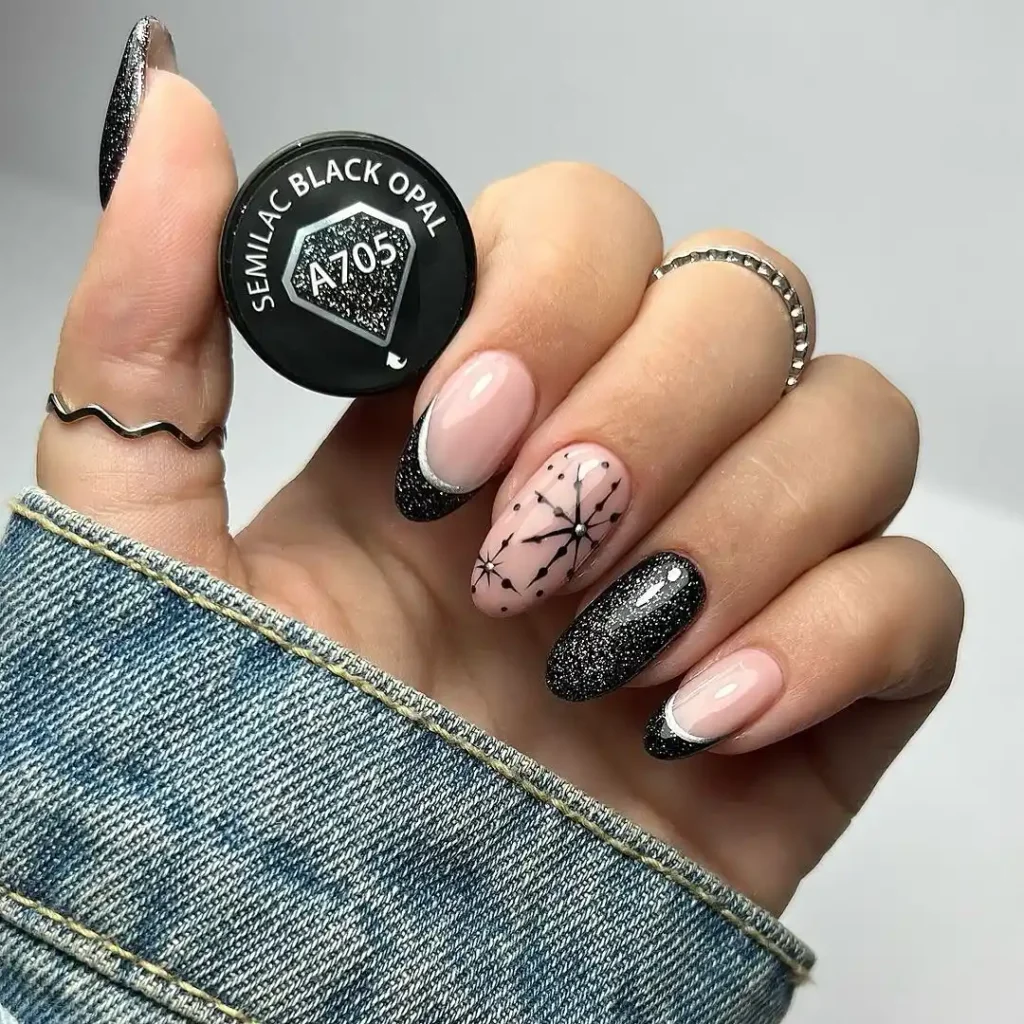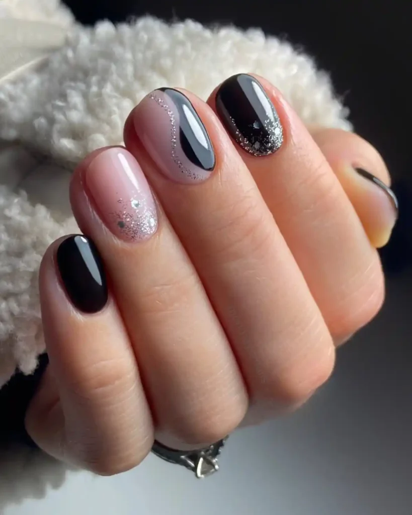 I’m so into how calm this looks. Most of the nails are this sheer nude-pink, then two are glossy black with delicate silver glitter curves that almost disappear until the light hits.